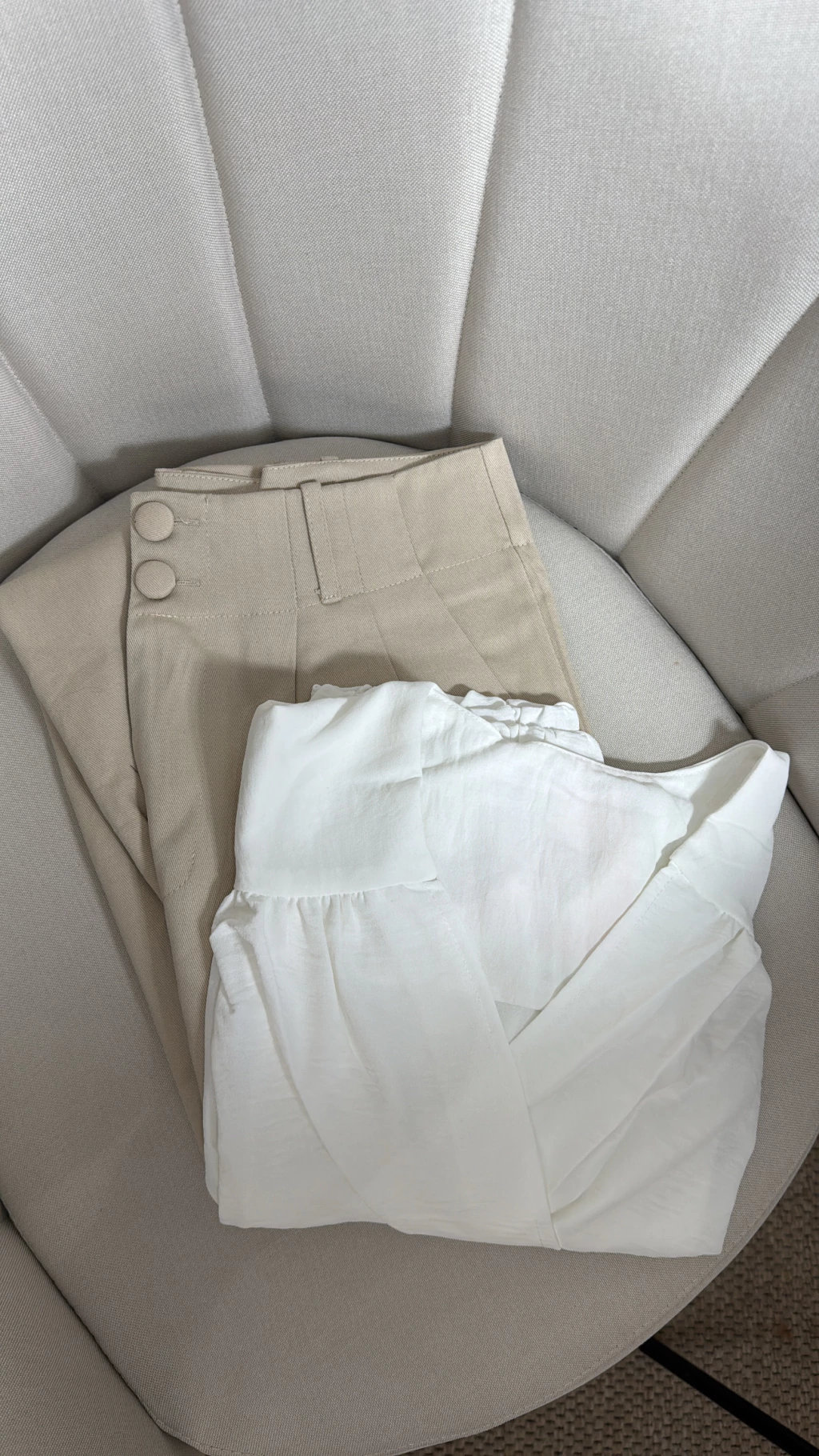 Combo 2: Tamanho G (Calça de sarja areia + Blusa transpassada branca)