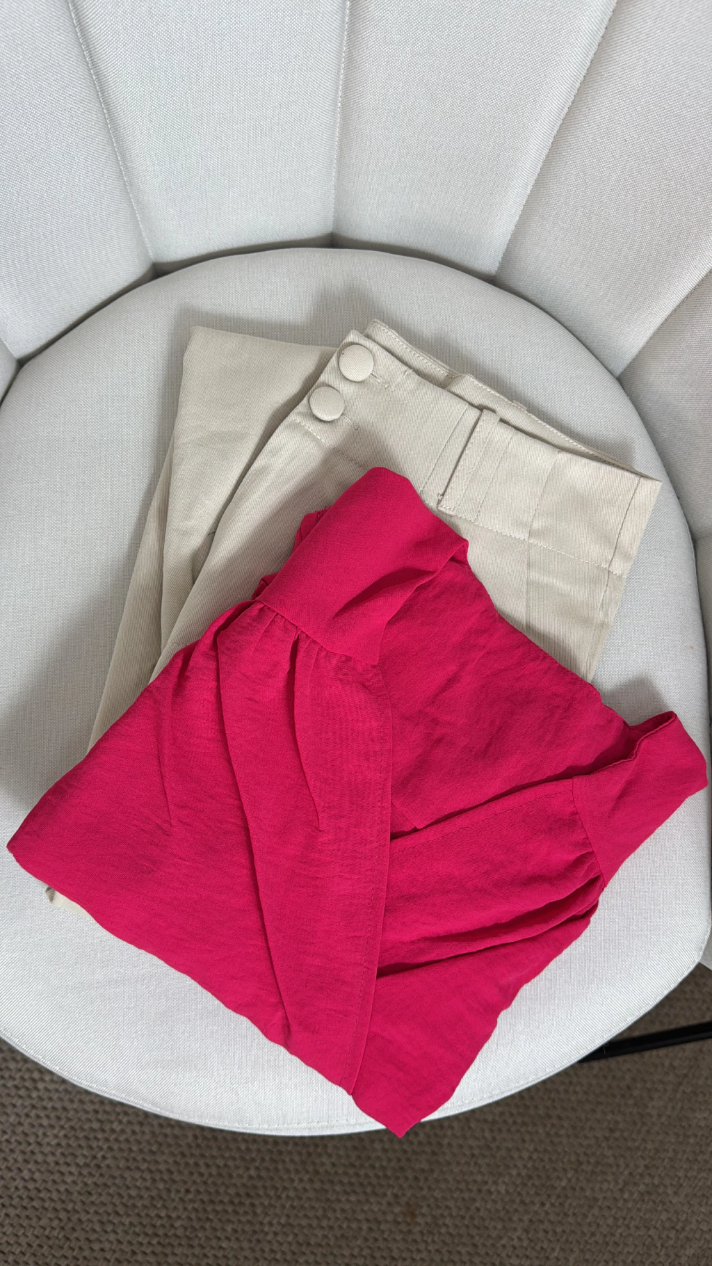 Combo 4: Tamanho G ( Calça de sarja areia + Blusa transpassada pink)